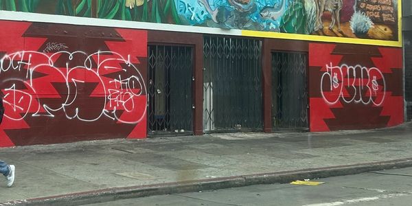 "Five Sacred Colors of Corn” at the entrance to Balmy Alley on the corner of 24th Street. Created in 1991, then removed, reassembled and restored in 2021, it is one of the most visible mural in all the Mission. The bright primary colors recall the children who helped design this mural in 1991 for the International Year of the Child. "We thought the mural was going to be temporary, that the building was going to be torn down," Precita Eyes founder Cervantes noted. "But it stayed up for 30 years as the housing project kept being delayed." When the old structure was finally demolished in 2021 to build low-income units for seniors, developer Mercy Housing "realized that the community had grown up with this mural, and they should preserve it as a community cultural asset."