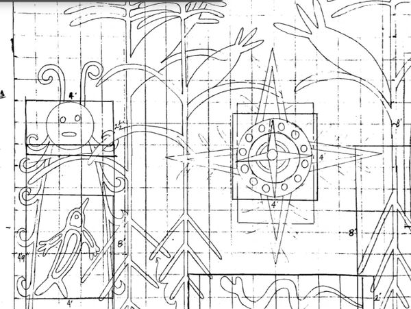 Details in the mural include Huichol yarn paintings and sculptural wooden figures in relief recalling the centrality of maize in the Mesoamerican cosmos; a woman giving birth; an Egyptian goddess devouring the sun, then giving birth to it; Grandfather Fire, framed by stalks of corn; an Earth goddess, a hummingbird and snake and dog as spirit animals.
